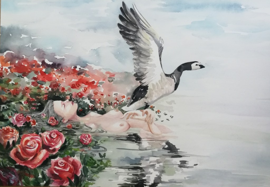 Zeker mijn laatste schildering ‘Elisa’, met de brandgans, is daar een perfect voorbeeld van. Het voelt prettig en prachtig op het eerste gezicht maar daarna vraag je je af wat er gebeurt is. ‘Waarom ligt die vrouw daar? Gaat het wel goed? Maar wat is het mooi.’
